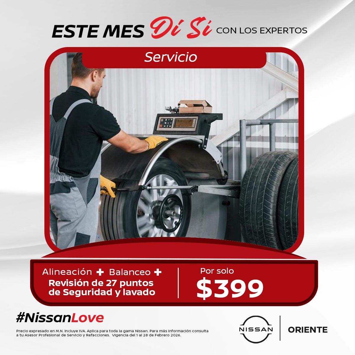 Precio expresado en M.N. Incluye IVA. Aplica para toda la gama Nissan. Para más información consulta a tu Asesor Profesional de Servicio y Refacciones. Vigencia del 1 al 28 de Febrero 2026.