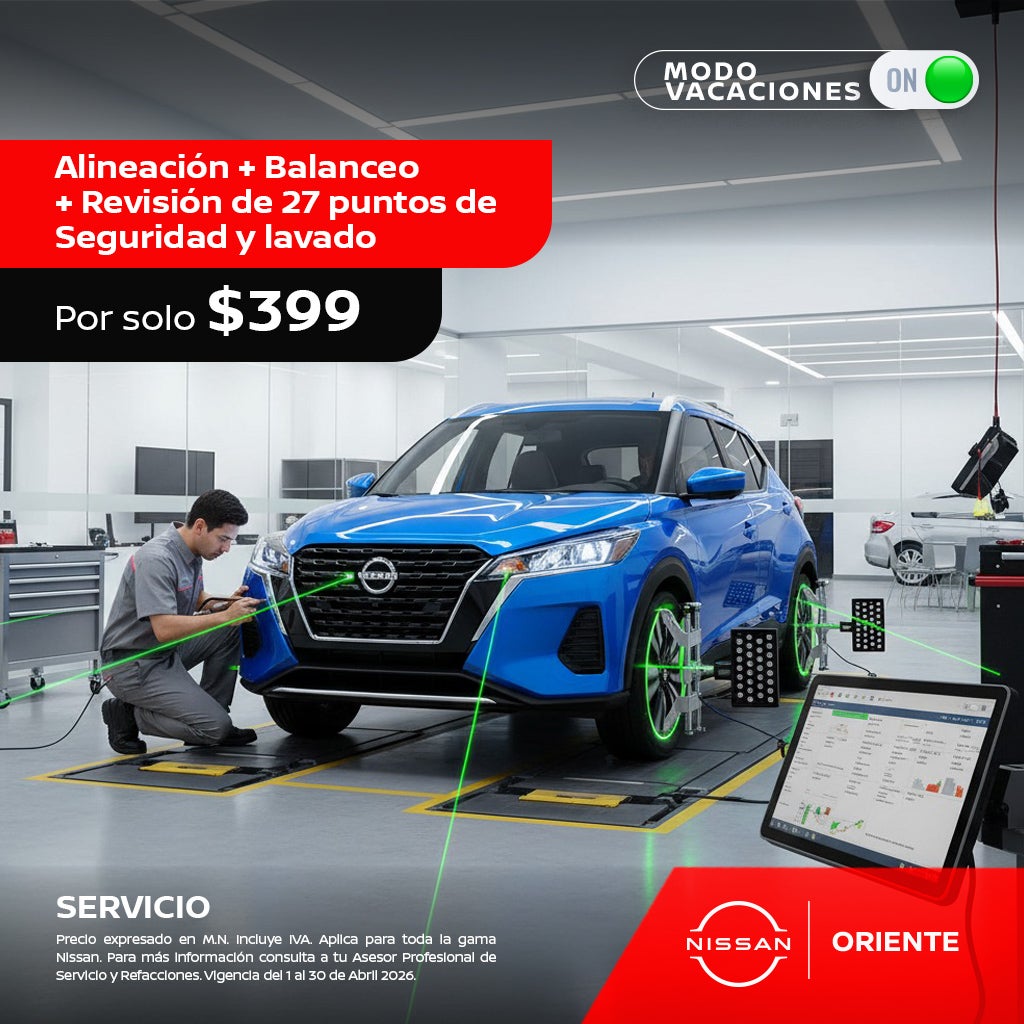 Precio expresado en M.N. Incluye IVA. Aplica para toda la gama Nissan. Para más información consulta a tu Asesor Profesional de Servicio y Refacciones. Vigencia del 1 al 30 de Abril 2026.