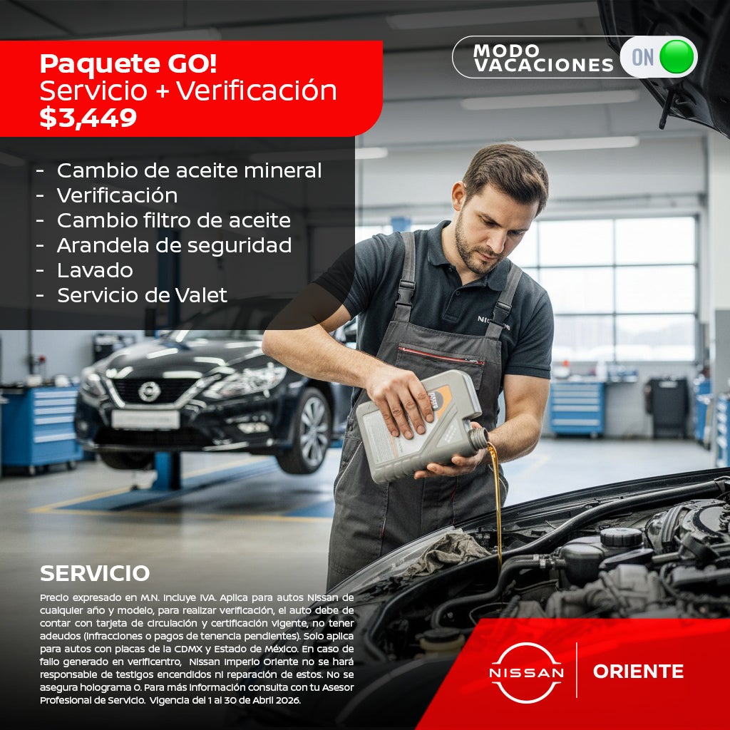Precio expresado en M.N. Incluye IVA. Válido con aceite mineral. Promoción aplica para únicamente para SENTRA, X-TRAIL, ALTIMA, PATHFINDER, KICKS cualquier año. Aplica hasta 9 meses sin intereses con tarjetas de crédito Banamex y BBVA. Para más información consulta a tu Asesor Profesional de Servicio. Vigencia del 1 al 30 de Abril 2026.