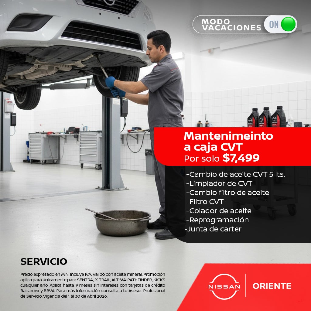 Precio expresado en M.N. Incluye IVA. Válido con aceite mineral. Promoción aplica para únicamente para SENTRA, X-TRAIL, ALTIMA, PATHFINDER, KICKS cualquier año. Aplica hasta 9 meses sin intereses con tarjetas de crédito Banamex y BBVA. Para más información consulta a tu Asesor Profesional de Servicio. Vigencia del 1 al 30 de Abril 2026.